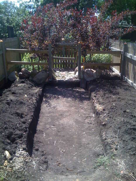 Ahora comienza la diversión! excavar la zona respetada a la profundidad deseada. (base + playsand + espesor de la piedra de pavimentación) Usé un nivel largo intentar y conseguir nivel como sea posible con una pequeña pendiente para drenaje de agua (pendiente de cualquier modo usted desee agua para escurr, no una vertiente drástica aunque no quieres ser demasiado sensible.) una vez que esto se logra ir al paso #4 menos que usando los amarres de RR.