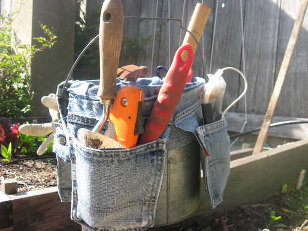 añadir bolsillos de jeans viejo a un cubo para organizar las herramientas de jardín. En lugar de tirar tus jeans viejos, utilizar la mayoría de esos viejos pantalones para hacer un cinturón de herramientas para la correa alrededor de un cubo. Hacer esto sin comprar ningún material nuevo y personalizar sus bolsillos dependiendo de qué herramientas te gustaría usar.