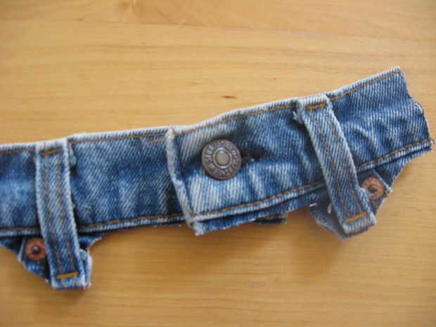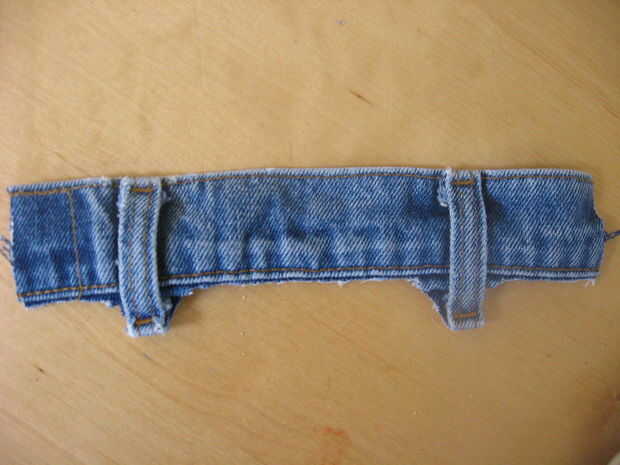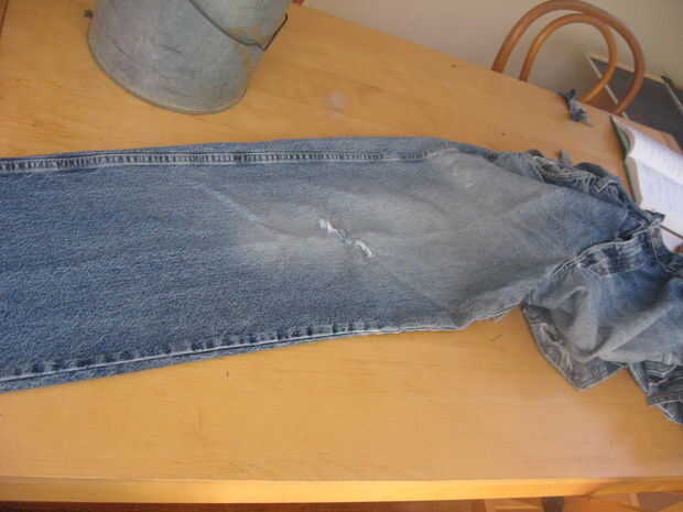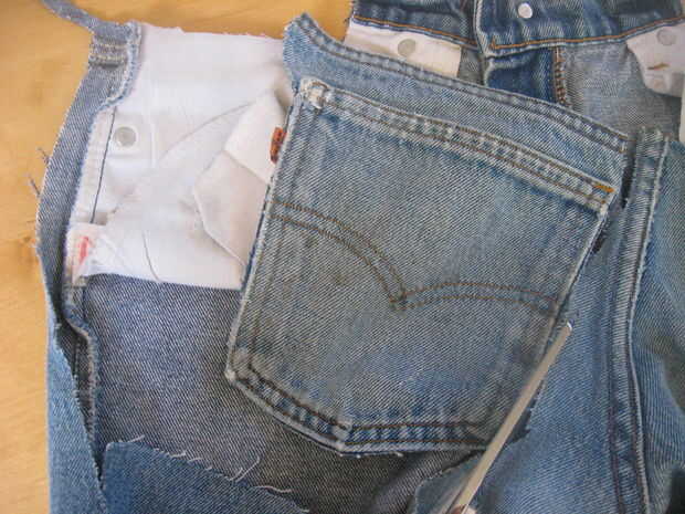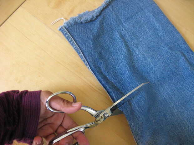 Corte alrededor de los bolsillos traseros de un par de jeans. Si quieres cuatro bolsillos, necesita dos pares. Corte de pares de lazos de la correa. Corte un pedazo largo de la entrepierna de la pierna (entrepierna a tobillo) con aproximadamente 3 pulgadas de tela de cada lado de la costura. Corte la parte inferior de los pantalones para hacer bolsitas para organizar dentro del cubo.