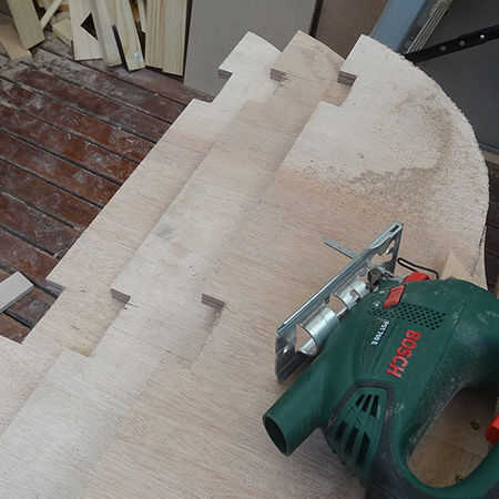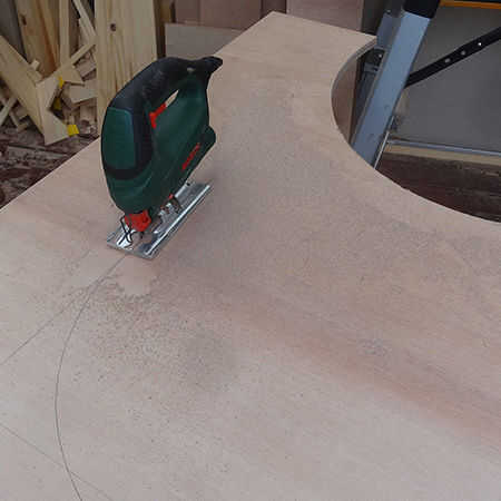 1. los lados y soportes del centro fueron cortadas de la pieza de 900 x 900mm de contrachapado. Las curvas fueron dibujadas usando la tapa de una barbacoa. Cualquier elemento circular grande puede servir como una plantilla.