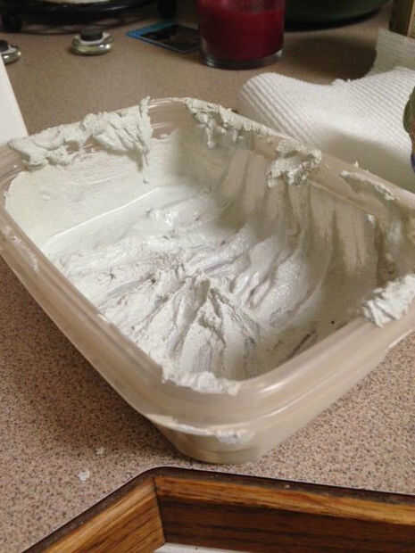 En un recipiente desechable (yo usé un recipiente de carne de almuerzo), siga las instrucciones en la bolsa de lechada. Mina dijo 7 de partes de agua y lechada de parte 1, pero tengo que ser honesto, que no significa nada para mí. En serio, ¿qué es aún? Sólo comentarlo y había hecho más como arena húmeda que se podría hacer un castillo de arena con porque no lo queremos muy acuosa. Tuvo que tener suficiente estabilidad para que no caiga de la bola de espuma de poliestireno como usted solicitó.