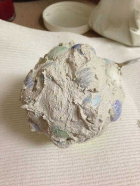 Aplicamos la lechada utilizando nuestras manos. Cucharada para arriba y golpear sobre la bola de espuma de poliestireno. No te preocupes de lo que es bastante-que vendrá la próxima. Justo ahora que simplemente desee cubrir de los espacios entre las chucherías y si cubres por chucherías dijimos que está muy bien también.