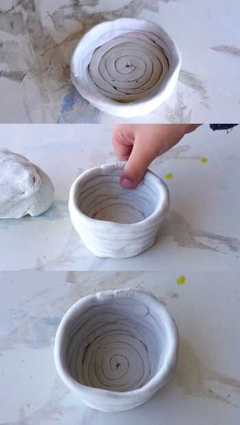 En primer lugar, hacer una serpiente de barro. A continuación, la bobina en forma de espiral para hacer la base de tu olla. Para construir los lados de la olla, añadir un poco de agua a la base para que sea pegajoso. Rodillo el otro trozo de arcilla en forma de serpiente y coloque la arcilla sobre la base. Enróllela alrededor para formar los lados de la olla. Mantener enrollado a los lados y añadir el poco más de agua para unir las bobinas.