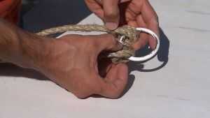 3. Tome el anillo de metal y el hilo de la cuerda a través del anillo hasta llegar a la mitad.
