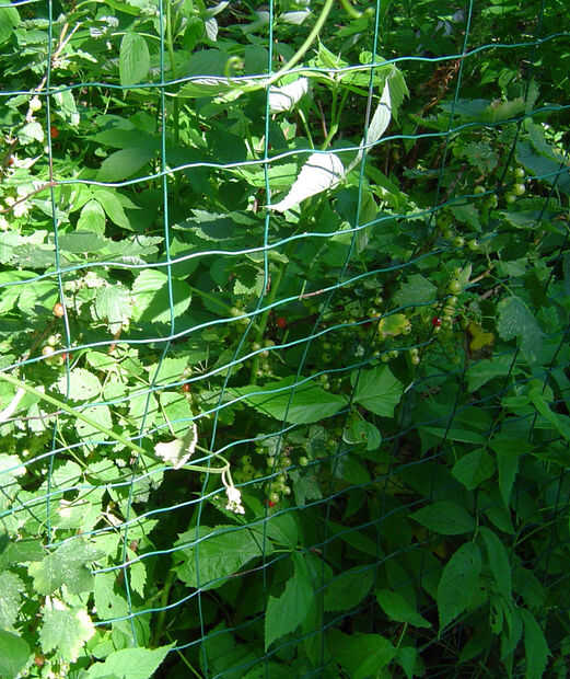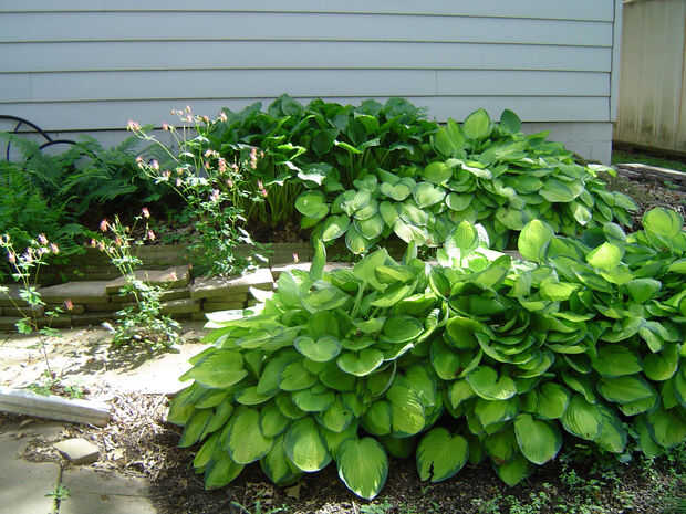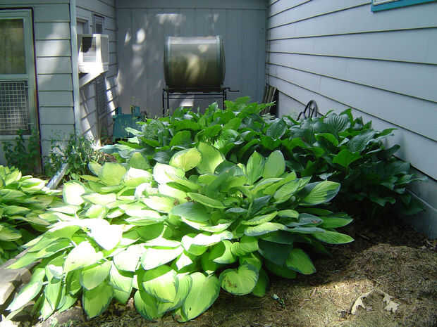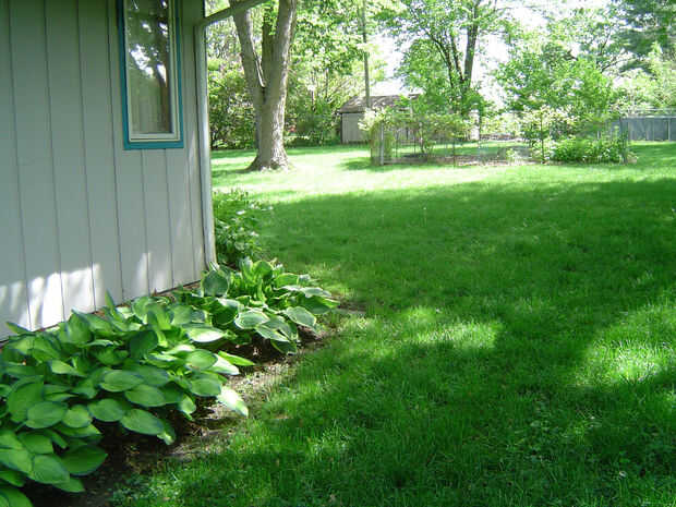 Las hostas recorren al patio trasero y se puede ver el jardín de frutas en la distancia. Las grosellas son maduración para arriba y se utilizará para las galletas de grosella. también tengo fresas, frambuesas, arándanos, arándanos y cerezos. Oh sí, también hay una hermosa vid de uva con una gran cantidad de uva a partir.