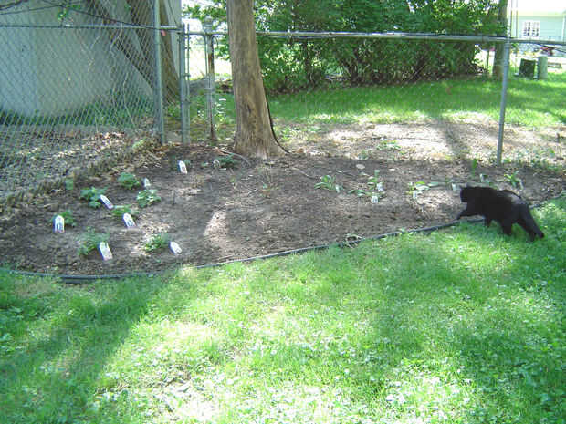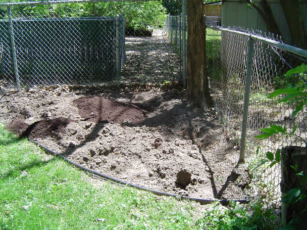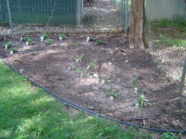 Otra área he trabajado en esta primavera es una descuidado esquina trasera de la propiedad con una vieja mesa de picnic que se decae y un montón de malas hierbas.  Sacó la mesa y limpiar las malas hierbas.  Desenterró un área y había instalado ribete de plástico negro.  Hemos modificado el suelo con compost desde el sitio de desechos de yarda y planté malva, Delphinium, margaritas y geranio salvaje.  Quiero una sensación antigua a este jardín de flores.