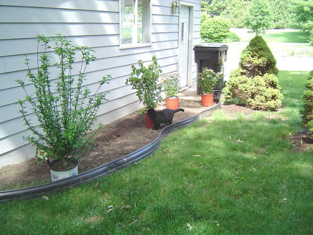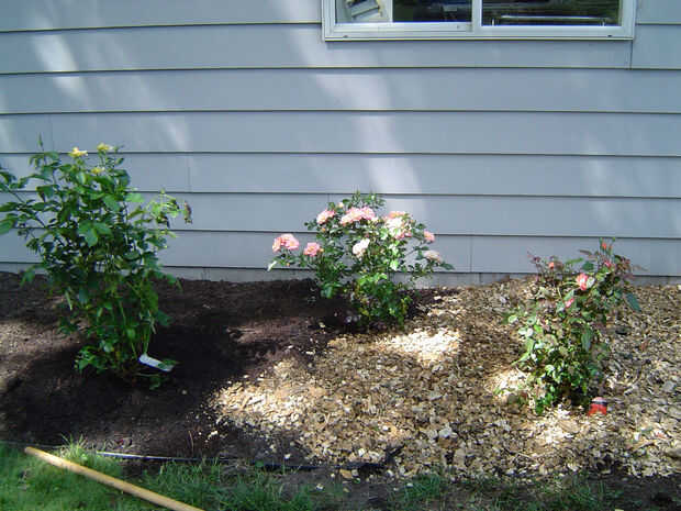 Hablar de jardines de rosas, nos plantamos uno ayer.  El pasto y malezas fueron quitadas y el ribete de plástico situado en el suelo enmendado con compost.  He plantado tres tés híbridos y uno gradiflora rosa, en Durazno, rosa y tonos de amarillo.  La planta alta el final es una rosa de sharon.  Es blanco con tonalidades púrpura.  La cama estaba cubierta con lecho de astillas de madera.  Va a mover el rambler rojo rosa a esta área con un enrejado para que lo apoyen.