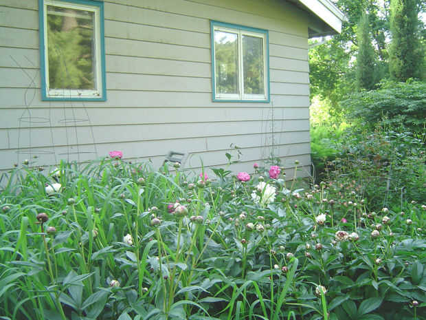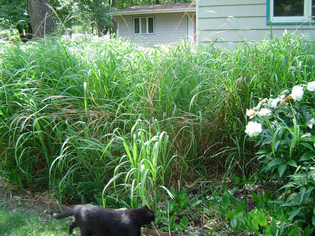 Este es el proyecto siguiente en mi lista.  Esta hierba de pampas comenzó como un pequeño stand por esa ventana.  Incluso hojas de acero inoxidable en el suelo alrededor de él no contendrá este césped.  Necesito trasladar a un grupo en el medio del patio que puede ser cortado alrededor.  Esta es un área puedo utilizar un químico para controlar el problema.  Se propaga por los corredores subterráneos, y si todos no se quitan fácilmente empezar a crecer otra vez.  Voy a intentar quitar todo, pero puedo utilizar un herbicida con moderación y a regañadientes.  Blackie no se permitirá en la zona si lo hago.  Será un reto.  Probablemente tengo que desenterrar las peonías, demasiado.  Entonces necesito un nuevo jardín para ponerlos.  Apenas va en.