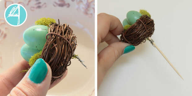 Completa el paso 3 para tantos huevos como le gustaría añadir a su nido. Asegúrese de que retorcer todos juntos en uno. Cuando se ha agregado como muchos como usted desea, alambre Envuelva un palillo de dientes en el vástago del pequeño alambre que creó.