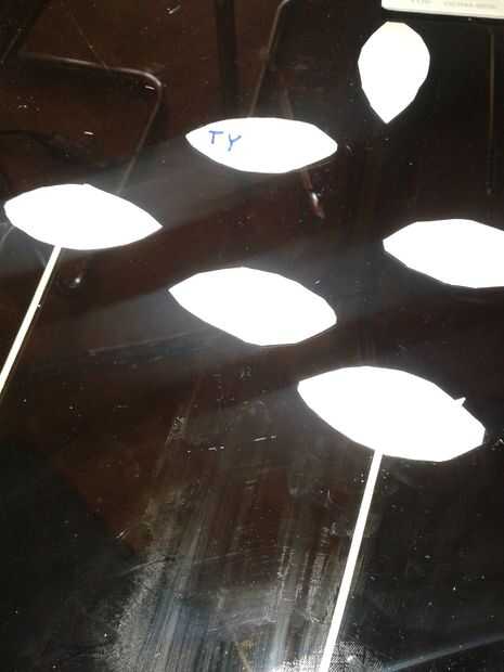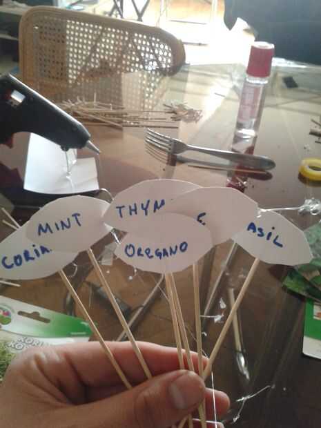 Corte hojas de papel y hacer el nombre de la etiqueta para la cultura lo que quiere la planta y escribir el nombre. Que pegar con palo de madera para el soporte.