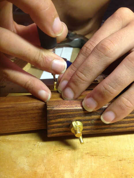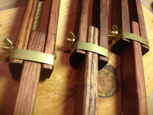 Para agregar las tiras de latón, me perforó un agujero en un lado del latón y había atornillada con tornillos para madera bronce pequeño. Luego dobló las hojas todo el camino alrededor de la pierna y perforados en el otro lado donde se realizó por otro tornillo.