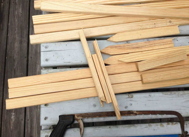 La primera cosa a hacer es ordenar a través de las estacas para asegurarse de que están escogiendo las que no agrietadas, rotas o anudadas. También quiere asegurarse de que son grosor similar, podría no ser obvia ahora pero es importante más adelante. Toma 9 de los mejores que puedes encontrar y poner hacia fuera la forma en que desea las piernas para ser. Dependiendo de la altura final deseada, medir y cortar las estacas para que sólo 3 tienen una punta y el resto es plano.