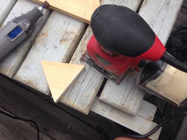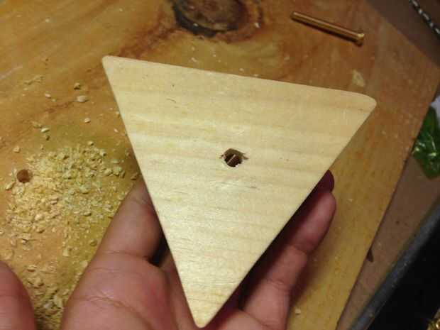 Esto es donde la pieza de madera de desecho. Fui con una base triangular para la simplicidad. Es bastante sencillo unir 3 patas a una forma triangular. Primero recorte el triángulo y arena hacia abajo y los bordes redondeados. Entonces taladró el medio aceptar el 20 1/4 perno para el montaje de la cámara. El 20 de 1/4 pernos que tuve fueron 2 cortas, así que tuve que tallar un espacio con la dremel para dejar que se sientan más profundo dentro de la madera.