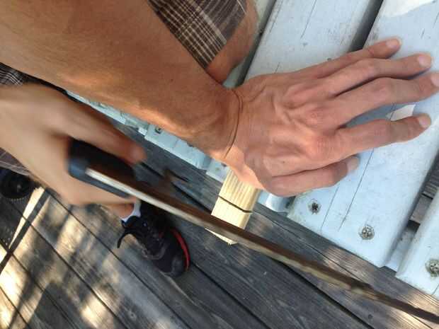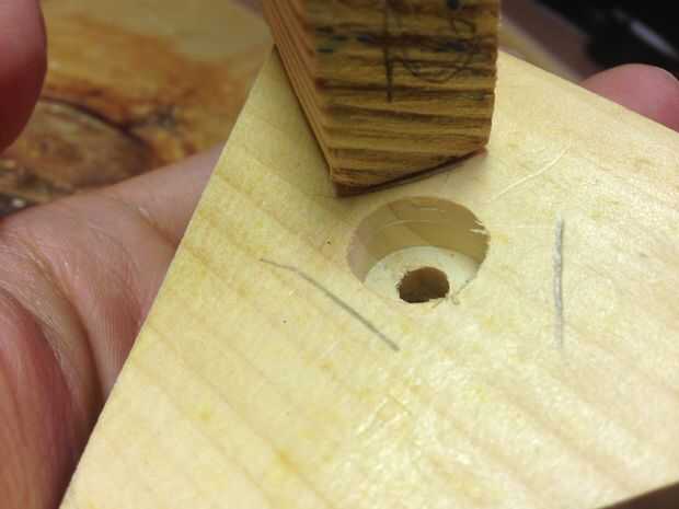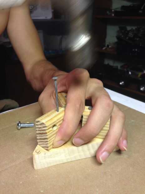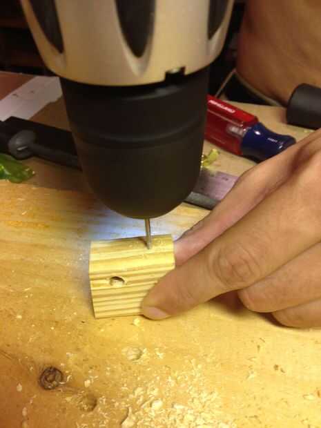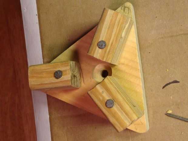 Después de que terminó necesitaba una manera de conectar las patas a la base. Cortar 3 piezas de pequeño y me perforó agujeros en cada uno de los. Terminé los perforación descentrada porque me di cuenta hizo la base un poco más pequeños y estaba preocupada por espacio para las piernas. Decidí les clavo a la base, así que perforé un agujero para evitar que se agriete. Las uñas terminaron siendo una mala idea porque ellos permitieron que las piernas giren libremente. Evitar mi error y con tornillos de madera desde el principio.