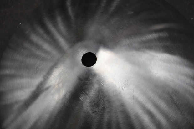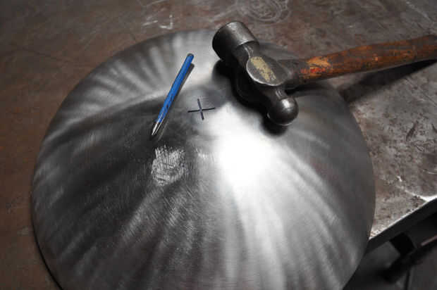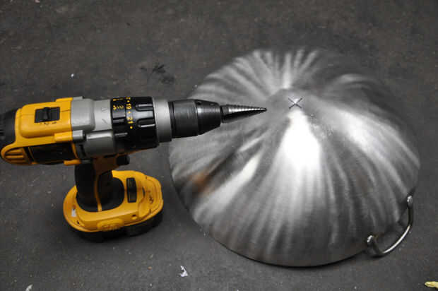 Localice y marque el centro del wok, luego centro de golpe. Asegúrese de que eres centro de perforación con un objeto duro respaldo hasta el otro lado. Si no tu marca será demasiado ligero y corres el riesgo de hacer un hueco grande. Ahora usando un taladro de paso en la figura 2, haga un orificio de 7/8. Si encuentra el bit errante centro volver atrás y hacer un punzón mejor. El acero inoxidable es muy duro y un montón de presión se necesita para obtener el primer agujero en el taladro de paso. Taladros de paso son una gran manera de hacer los agujeros redondos en materiales delgados. Taladros normales tienden a hacer los agujeros oblongos en materiales finos y un gran agujero no es realmente recomendar con brocas estándar. Un taladro de paso se puede encontrar en su tienda local de hardware en la sección de taladro, o en el área eléctrico para hacer knock outs para conduit EMT. no son baratos y una solución más económica es un serrucho. Éstos vienen en los tamaños de diff. Utilice 7/8 para la tuerca de ajuste (esta build) o 1 1/8 orificio para la soldadura en acoplador y el tornillo en.