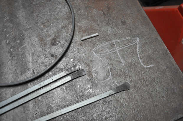 Luego cortar 3 16" pc y martilló el extremo sobre el yunque, con el tenedor doblado doblar las piernas para que coincida con mi dibujo.