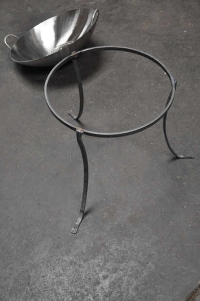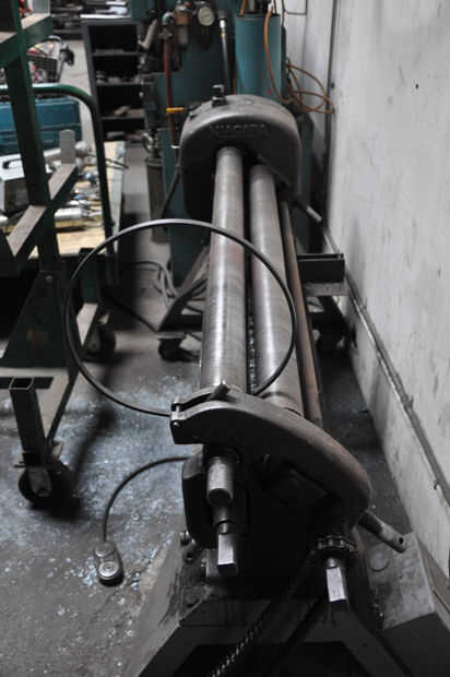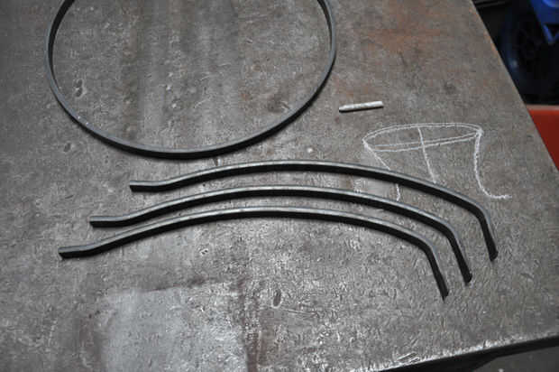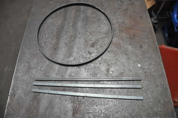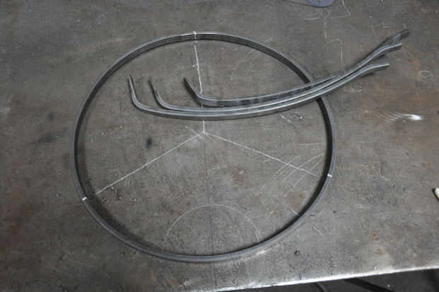 Primero el acero laminado en un rodillo de deslizamiento. Esto podría hacerse también con una flexión fork.you puede hacer uno con un tornillo de sujeción de dos pernos de 3/8" aparte. Ahora aprovechar el acero entre y bump (pequeña curva, curva de movimiento 1/2 otra vez) hasta que tiene un anillo. Soldar los extremos juntos y luego nivelar con un martillo.
