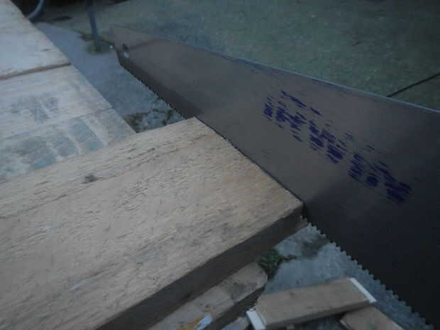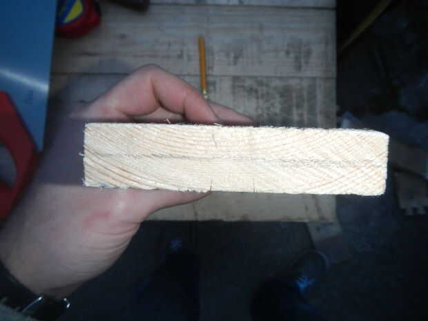 Use la sierra para cortar a la línea de mitad de camino asegurándose de que no van sobre él mantener el nivel de la sierra y luego corta en el extremo para tu primer corte. Si tienes un cincel probablemente fácil de cortar el primer corte. está en el extremo del grano debe seguir y permanecer bastante recto.