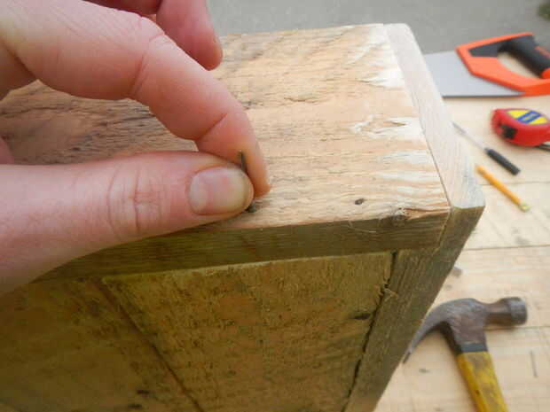 Asegúrese de que mantener la Plaza de las esquinas del pegamento y clávelos. Use un clavo adicional para martillo los clavos en un poco más. (si tiene uno un golpe fino sería mejor para esto)
