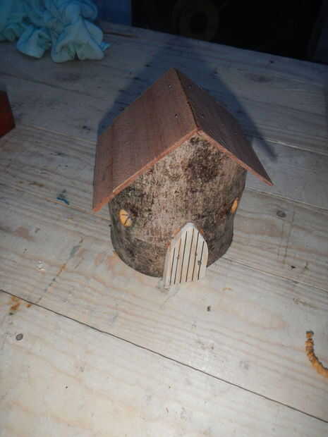 Casa de hadas - usando una sección de un árbol con un techo, añadir una puerta y algunas ventanas de madera. Añado algunos techos cuando puedo conseguir alguna paja.