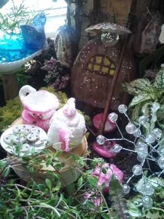 FREGÓ la yarda de palillos y bejucos (trust me no era tan difícil en nuestro patio)... con mi mejor amigo fiel Sr. Glue Gun me fui a la ciudad... Hice sillas, un puente, columpios, una mesa y cerca de la línea! Mi hada "casa" fui a la pila de registro... del hogar encontró un adecuado registro pequeño y pelado alguna corteza "curvy" de otros. Os adjunto la corteza con curvas en la parte superior del tronco formando un "techo". Maridito no me deja utilizar a la clavadora de aire, pero él conseguirlo para mí. Chico lo hinchan a! Pegué las ventanas y puertas sobre el muñón. Utilicé una concha para un porche "toldo" y pegado un mármol claro con glitter Plata como una luz de porche! (ahora puede ver la locura de la miniatura no puede usted!)