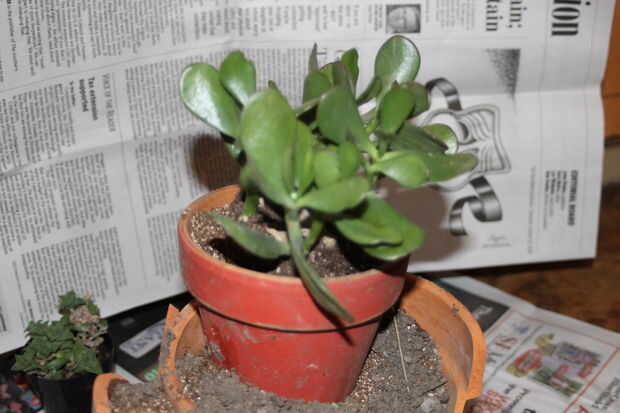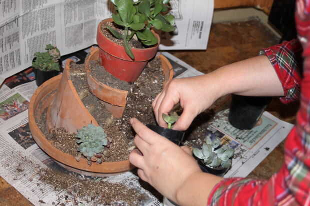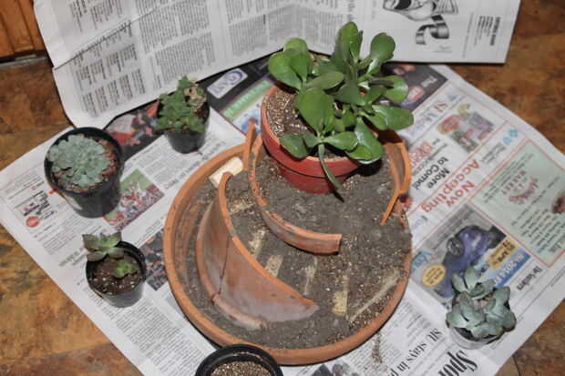 Añadí una planta suculenta más grande a la olla de barro pequeña en la parte superior y había agregado varias suculentas más pequeñas en puntos al azar. Después de agregar las plantas yo les regaba bien y espera que el gato no tire de ellas fuera de las macetas.