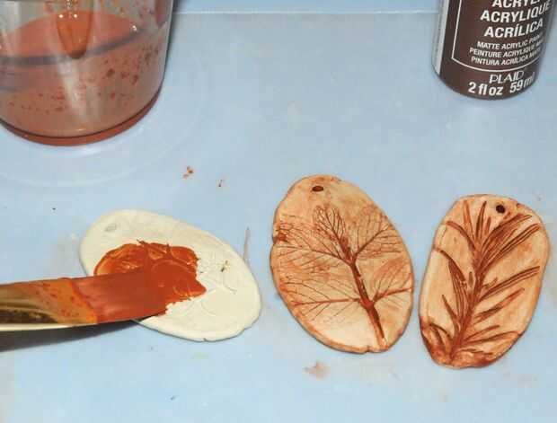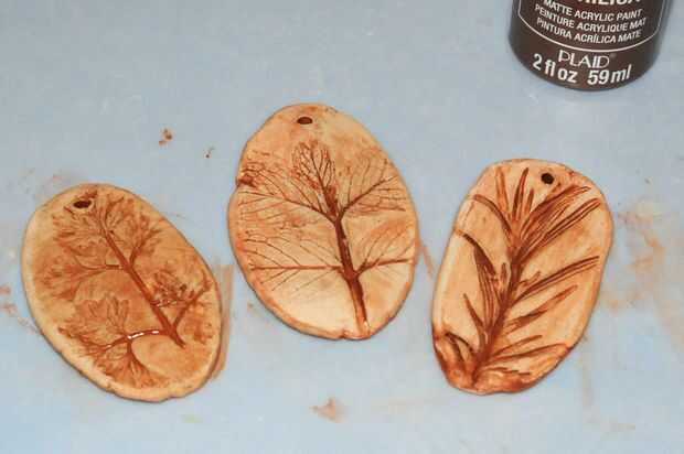 Cuando esté seco, diluir la pintura de acrílico oscurezca y hacer un lavado para el colgante.