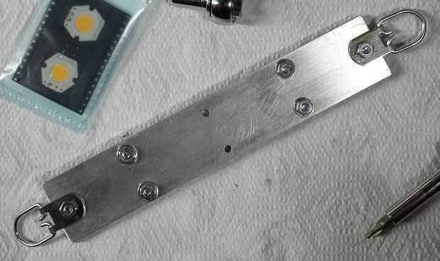Para el disipador de calor opté por 1-1/2 "× 1/8"aluminio y corte 2 piezas de 8". Después de las dos piezas de sujeción juntos ocho hoyos fueron perforados con un taladro de 5/32 bit con los dos orificios para ser utilizado para montar el LED. Con tela de esmeril de grano fino las piezas fueron luego pulidas a un final pulido liso. tornillos de máquina 8-32 × 1/2 se utilizaron para fijar las dos piezas con tuercas y arandelas de fijación y así como los dos colgantes soportes.