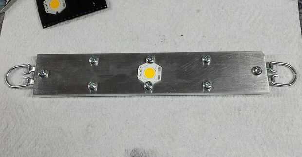 Aplicar una cantidad adecuada de pasta térmica en el plato de aluminio en la parte posterior del módulo. Empuje suavemente hacia abajo teniendo cuidado de no tocar la lente de fósforo amarillo. Atornillar suavemente alternando entre tornillos como apriete.