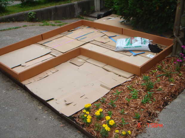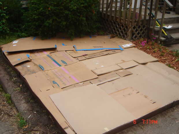 Colocar la capa de mantillo. Cubrir completamente el área mediante la superposición de las hojas. Usted no debe ver césped a través de la cartulina. Esto suprime las hierbas y malezas.