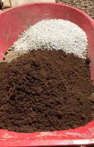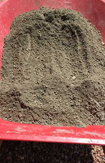 Usando la receta en la introducción, mida los ingredientes en una carretilla (puede utilizar una lona si usted no tiene/quiere utilizar una carretilla). He utilizado 1 cubo por cada parte, esto me dio bastante hypertufa para llenar el marco y hacer tres potes (también podría ser utilizado para el anclaje de la estructura metálica pero usted tendrá que planificar con anticipación, consulte «Instalación»). Ajuste la cantidad para satisfacer sus necesidades. Usando guantes, mezclar los ingredientes secos antes de añadir el agua (esto hace más fácil incorporar a todo una vez que se añade el agua). Añadir el agua un poco a la vez, mezclando después de cada adición, hasta obtener la consistencia de queso cottage (ver imagen).