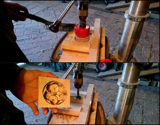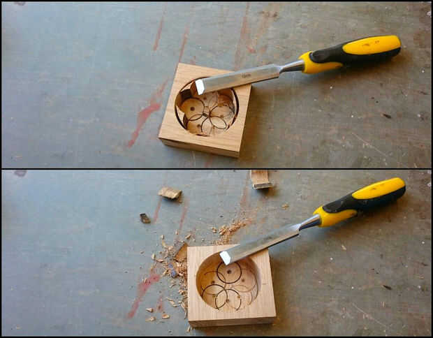 Quité la broca centradora en la sierra para que no tenga un orificio de poco atractivo en la parte inferior. Hacer esto significa que la Sierra sea super difícil de controlar. Tuve que crear otra plantilla para sostener la pieza base para prensa de taladro (ver fotos). Ni se te ocurra hacer este freehand! Verificar el tope de profundidad tres veces también es una buena idea. Cuando el perímetro exterior se perforó hacia fuera, he quitado la mayor parte del interior con la pieza Forstner. El resto fue fácil peasy con cincel agudo. O se puede invertir sólo en pieza Forstner de 3 pulgadas y hacer con él.