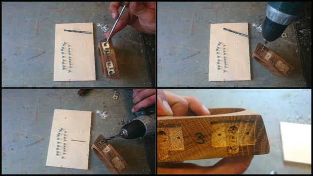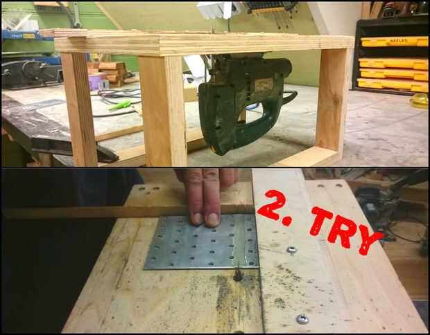 - Decidí ir con la placa de construcción gruesa de 2 mm (usada para conectar las piezas de madera). Este método significó que no tenía que perforar los agujeros. Adjunto una sierra caladora con hoja para cortar boca abajo y me agregó una valla pequeña para guiar mis cortes. Esto podría haber trabajado, pero los cortes no fueron tan rectos como esperaba y dejó allí.