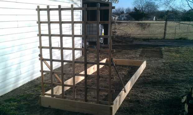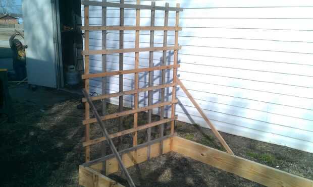 Una vez que todos los listones fueron atornillados, puse en su lugar y atornillada en el interior de la Junta final. Poner refuerzos en los lados para ayudar a sostener, obtiene realmente mucho viento aquí en Oklahoma y también no quiero el peso de las plantas que tire de ella y romperla. Puedes ver en la foto de mi hija me bombardearon en el fondo. Ayudó a mantener en su lugar mientras que puse las llaves. Este es el producto terminado, ahora sólo necesito suelo, semillas y el buen tiempo para empezar.