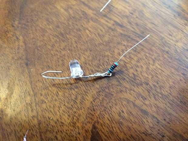 A continuación atamos la resistencia proporcionada al LED doblando el cable más largo por la mitad y envolviendo un extremo de la resistencia en el alambre doblado. Dobló el corto cable de LED en forma de bucle para la inserción fácil en la ranura de la batería de la flor. La imagen de arriba muestra cómo el LED y el resistor se veía antes de agregar a la flor. Asegúrese de que prueba el LED con la batería antes de pegarse en la flor.