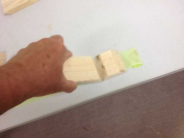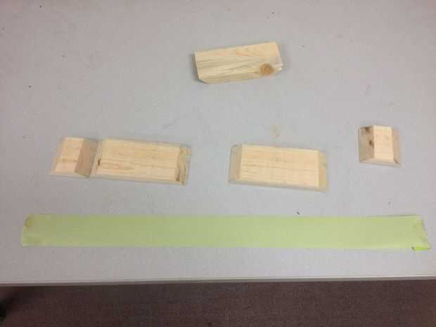 Comenzando en un extremo, coloque uno de los pedazos cortos de la cinta con los cortes en inglete hacia arriba. A continuación, donde el corte a inglete se llega a un borde afilado, colocar el corte a inglete de una de las piezas largo justo al lado. Cuchillo de borde a borde de cuchillo, por así decirlo. Cuando está apretado y cuadrado, colocar la pieza larga en la cinta. Continúe hasta que los cuatro lados están pegados a la cinta.