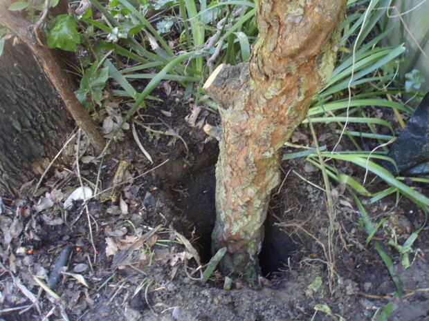 Basado en el diseño que usted elija por sí mismo, cavar profundos hoyos al menos la altura de su jardín. Usted también necesitará elegir decentemente gruesas ramas de los postes. Utilicé el más grande que tenía, que era sobre 100-150mm de diámetro. Estos puestos deben ser razonablemente rectos con las muescas del mínimo y la longitud debe ser al menos dos veces la altura de la altura del jardín (más algunas) - 1/2 será bajo tierra, 1/2 tierra arriba e izquierda un poco más de recorte al ras con las vigas de madera.