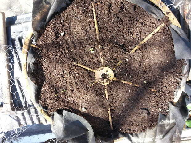 Añadir tierra a la tela, asegurándose de que los bordes de la tela permanecen sobre los bordes de la llanta para que no caiga al suelo.