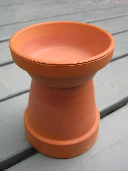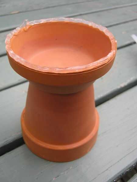 Una vez que estés satisfecho con el ajuste, voltee el par de depósito/platillo y aplica pegamento alrededor del borde del platillo. Entonces, voltee el par y presione el borde del platillo pegado al fondo de la olla grande. Espere hasta que el pegamento se seca.