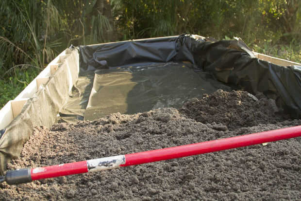 Si mal recuerdo justo tomó alrededor de 55 o 60 bolsas de tierra para rellenar a la profundidad que se quería.