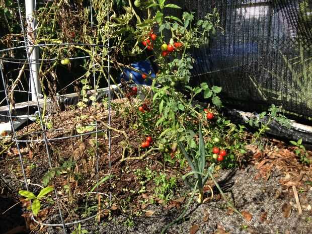 Estas últimas fotos pocos cuál es se quedan de la parte trasera de mis cultivos de primavera. La planta de tomate cherry solo mantiene escupir fruta. Tengo unas cebollas a la izquierda y tres plantas de la patata dulce. (no estoy seguro cómo lo harán en este levantado cama) las zanahorias y los pimientos.