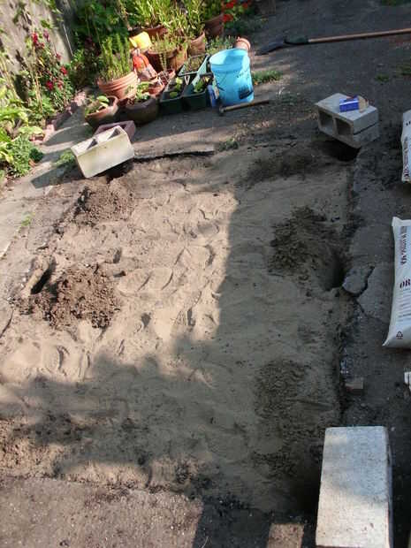 Utilizando un cincel roto, un martillo y un hacha escalado viejo que está picados hacia fuera de un bloque de 6 x 8' de asfalto. Hicimos un cuadro de redwood agradable con patas para anclarla en su lugar (tener que empotrar debajo el asfalto mantiene la suciedad "escape). Un vecino fue excivating su patio trasero (que no había sido tocada en más de 20 años) así que tomamos un puñado de su tierra, mezclada con compost y suelo de rellenado y ahora tenemos nuestra propia caja jardín floreciente.