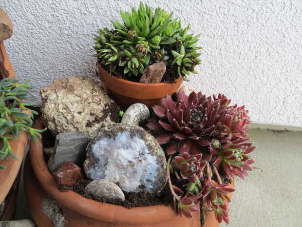 Utilizar algunos otros, más pequeños, macetas para crear una bonita 'Torre'. Uso de suelo y pulse, entre todas las macetas de flores para asegurarse de que la pila está construida firmemente. Poner suelo en las macetas y plantar las plantas del jardín de la roca. Finalmente decorar con rocas y piedras.
