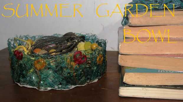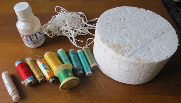 Esto es fácil, muy fácil. Usted necesitará sólo hilo y pegamento, nada más. Aquí estoy usando hilo de bordar de seda, tendrá diferentes tonos de verde, ya que es un jardín. Necesitará pegamento. Y algo para el tazón de fuente del molde. Usé un cilindro de espuma de 9". Se guita para la base.