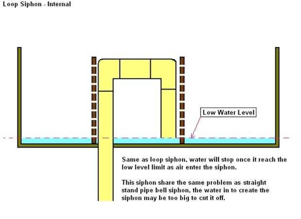 - En el lazo interno sifón que hice es circular (como el sifón de lazo) y atado a un elástico en la parte superior del bucle para dar el tubo un poco de "primavera" Esto hace que el sifón detener más confiablemente como salta un poco cuando engulle poco de aire.