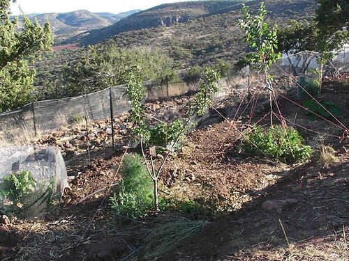 Nuestro objetivo final es terraformar nuestra propiedad todo 10, pero estamos empezando con un 3000 pies cuadrados zona sur 0f la casa. Esta primera huerta consta de cuatro terrazas, cada uno más o menos 10 pies de 80 pies. De parte de una colina orientada al sur formada por arcilla y rocas. Las plantas nativas incluyen acacia, roble y enebro, y hay muchas malezas comestibles (como cuartos de corderos, amaranto y verdolaga) que crecen silvestres. En un año promedio, obtenemos unos 25" de lluvia al año principalmente de junio a septiembre, con temperaturas anuales entre 25 y 105 grados F.
