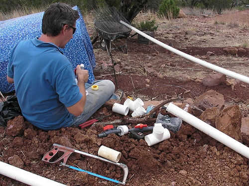 - El primer tubo que vamos a tratar es el tubo de PVC de 2" que corre de norte a sur, del tanque, a través de la primera terraza amplia de 10 pies y en las otras terrazas. Todas las piezas de PVC deben limpiarse con PVC limpiador y luego pegadas juntos, presionando y girando los tubos juntos mientras el pegamento está fresco. Asegúrese de que todos Ts y tal fin por la dirección que quieras.