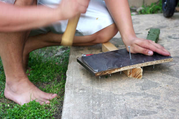 Creamos entonces un pedacito extraño poner en la parte superior de nuestra fuente. Esto fue diseñado para dejar un borde donde el agua podría piscina tan pronto como burbujeó para arriba a través del tubo y romper el borde uniformemente a lo largo de la parte superior de la fuente. La madera toboganes se quitan fácilmente una vez que el hormigón está endurecido, esto es sólo una buena manera de plasmarla para la funcionalidad.