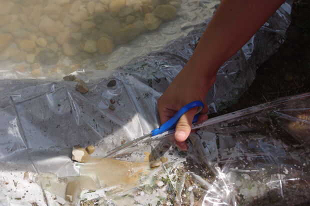Corte la cortina de ducha exceso en el borde.