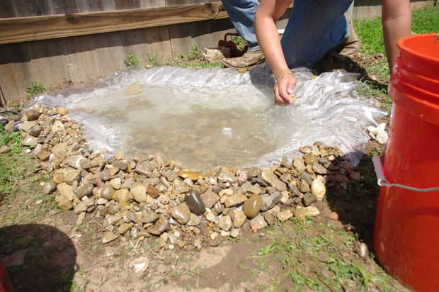 Si eres realmente ambicioso puede recoger piedras y rocas del río por su cuenta - sin embargo, compramos un par bolsas de guijarros de estanque $3 en la ferretería local.